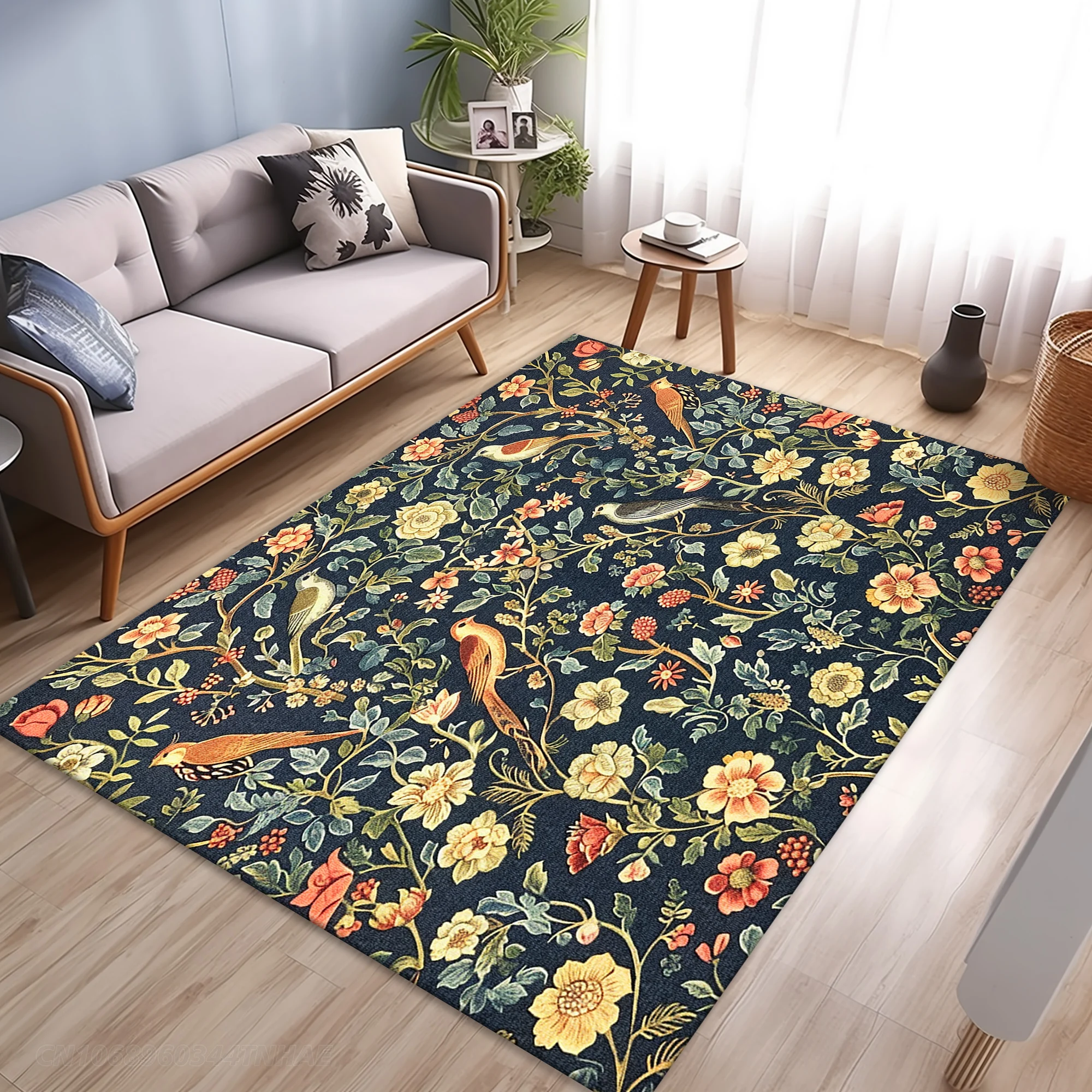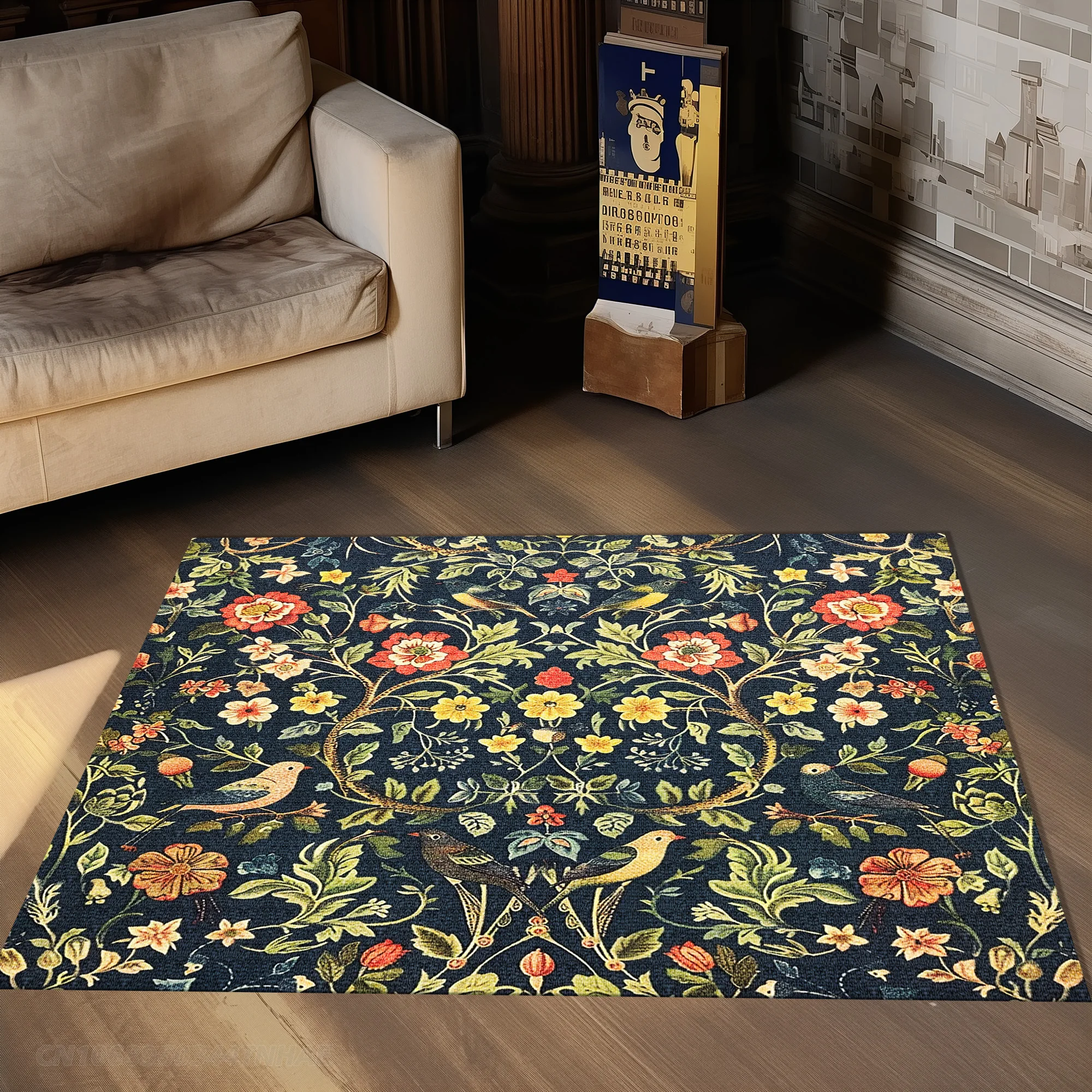 Medieval patterned rug. A beautiful dark colored rug with floral patterns and medieval style birds that will elevate any room. The carpet looks luxurious and is very pleasant. The rug is available in two patterns and several sizes. The carpet has a rectangular shape and a non-slip finish. Material: 100% polyester.