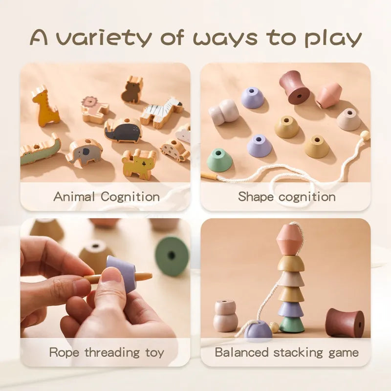 Obohaťte herní prostor svého dítěte s touto dřevěnou navlékací hračkou Montessori, která pomáhá rozvíjet jemnou motoriku, koordinaci očí a rukou, a také schopnost rozeznávat tvary, barvy a zvířata. Tato interaktivní hračka umožňuje dětem učit se základy techniky šití a navlékání korálků, což je činí skvělou volbou pro zábavné a vzdělávací hraní.