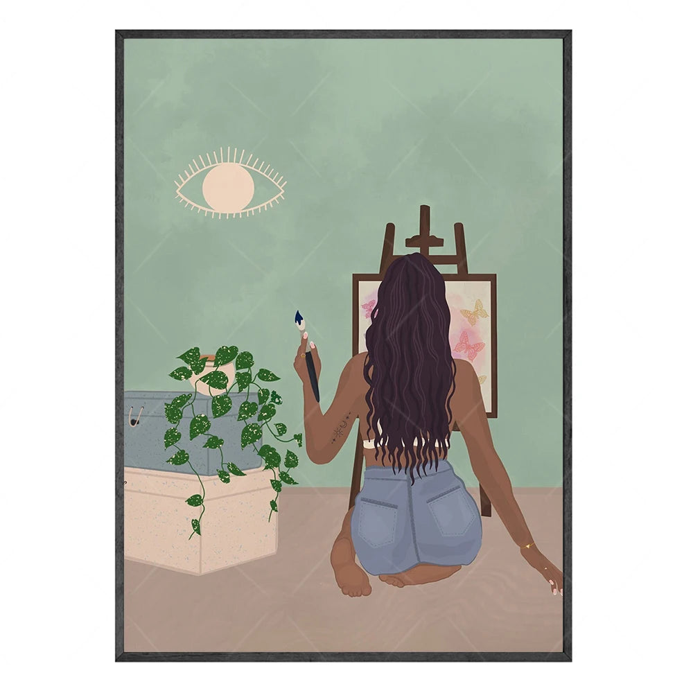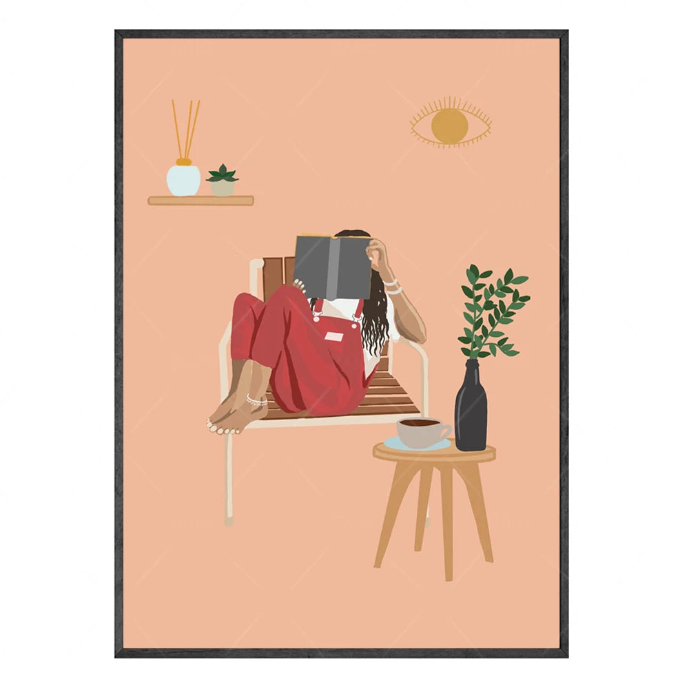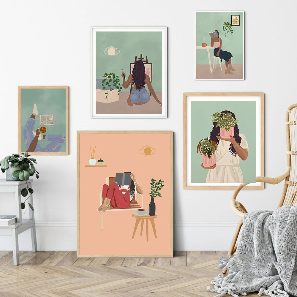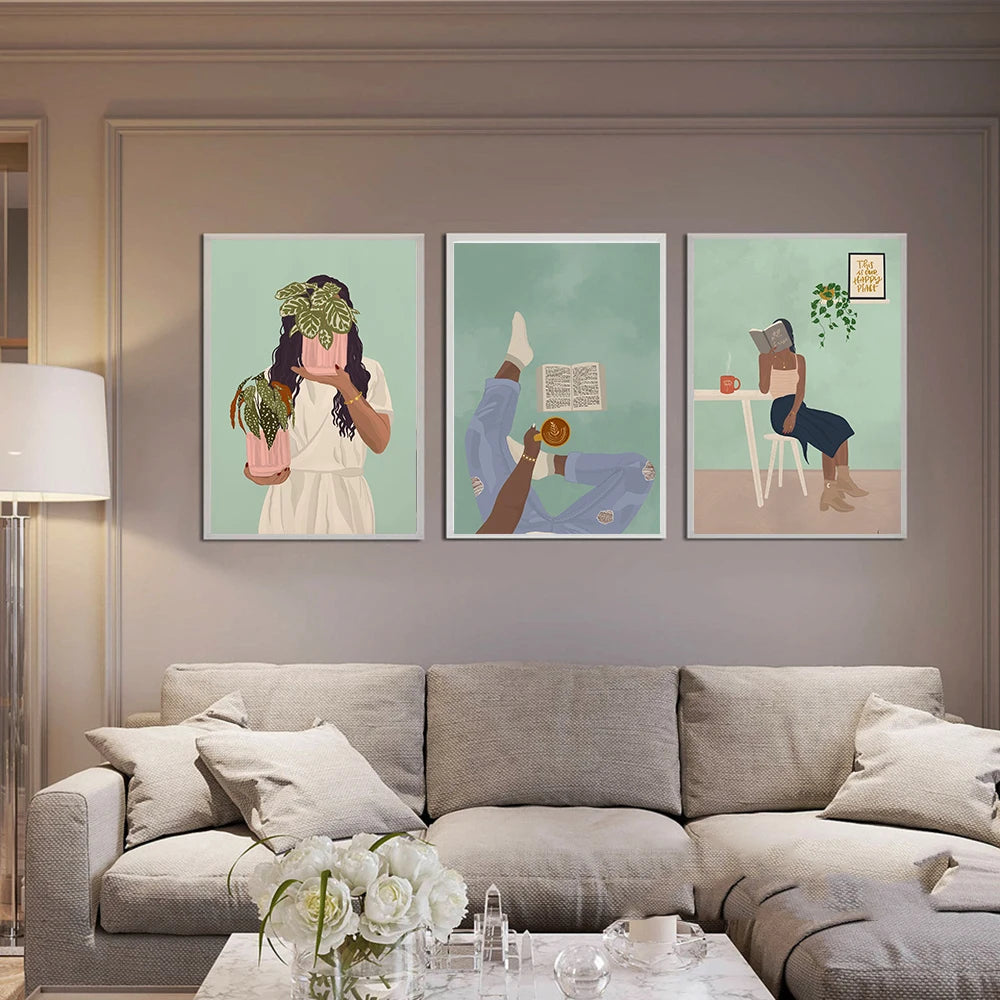 Obrazy Flora Woman tištěné na plátně. Barevné obrazy Flora Woman jsou v jemných barvách a znázorňují abstraktní výjev ženy s rostlinami v různých pozicích a z různých perspektiv. Každý obraz sám je zajímavý, ale můžete si vytvořit také set dvou a více obrazů v různých motivech velikostech. Žena na obrazech čte knížku, relaxuje, odpočívá, maluje nebo se stará o své rostliny. Obrazy Floral Woman působí klidně, bezstarostně a hodí se do každé místnosti v interiéru.
