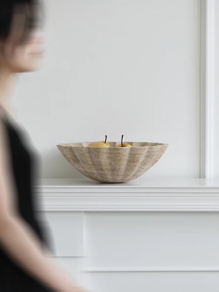 Mísa z travertinu Sally. Dizajnová vlnkovaná mísa z travertinu. Servírovací mísa z přírodního kamene travertin. Travertin je přírodní kámen s porovanou strukturou, podobný mramoru. Tato nádherná mísa může sloužit jako dekorace, ale také jako mísa na ovoce nebo odkládací mísa.