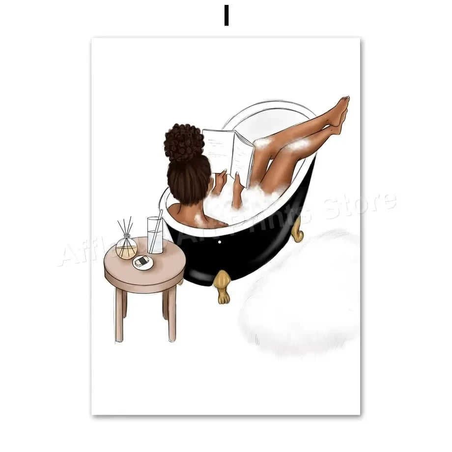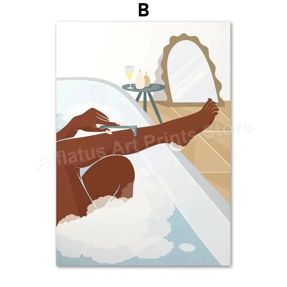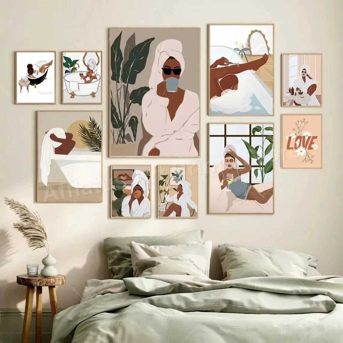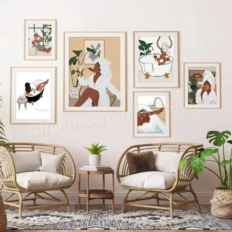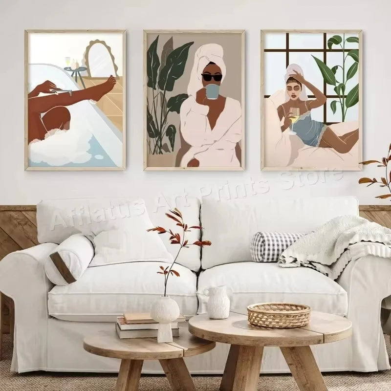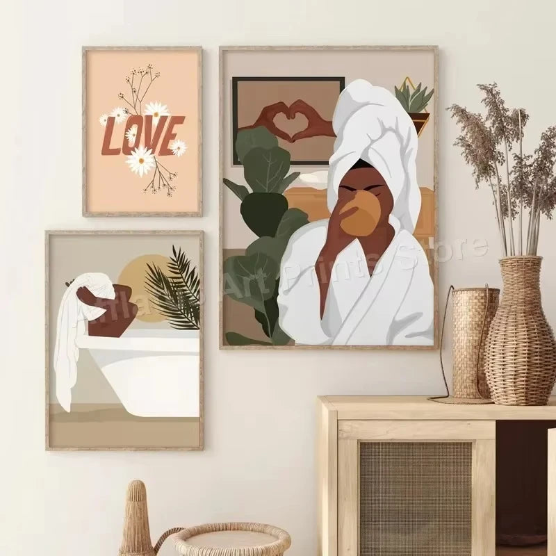 Obrazy na plátně Bathrobe. Sestavte si svůj vlastní set obrazů s motivem ženy v koupelně, která si dopřává péči a relax. Obrazy jsou v jemných tlumených barvách a můžete si je nakombinovat dle vlastní fantazie. Obrazy jsou dostupné ve třech různých velikostech. Obrazy tištěné na plátně bez rámu.