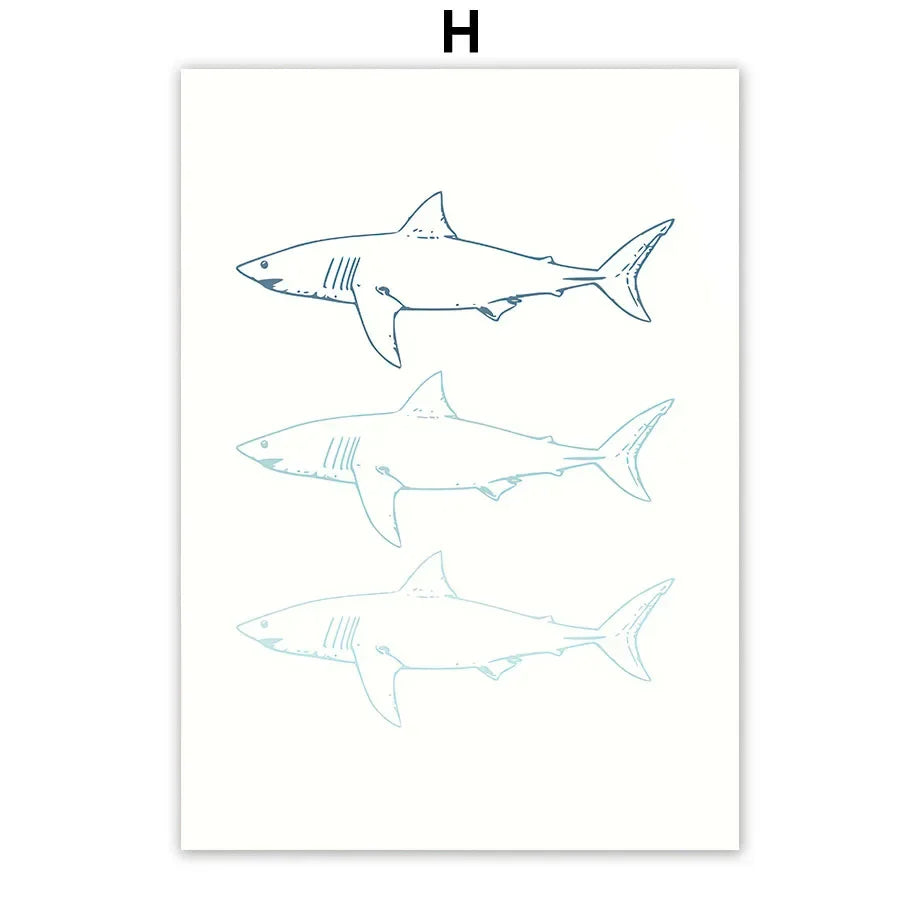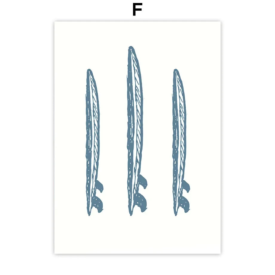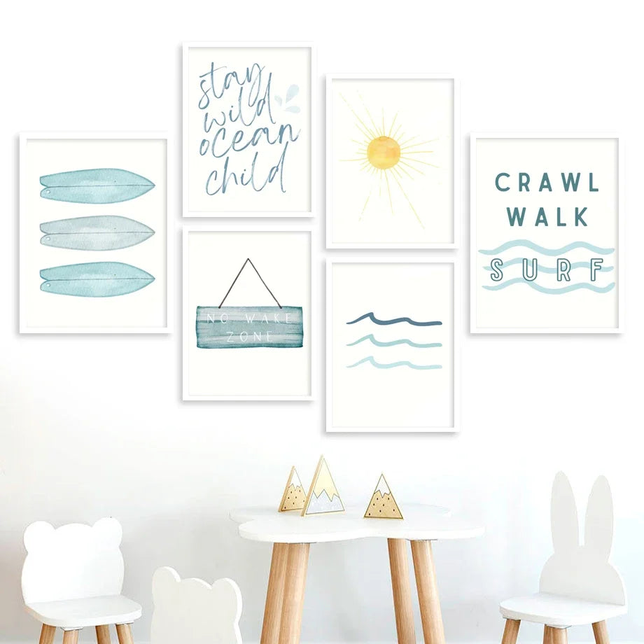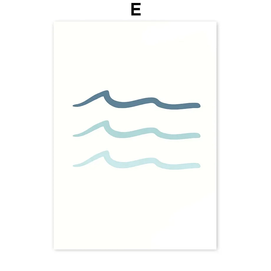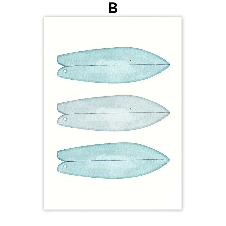Set obrazů tištěných na plátno Summer Surf. Obrazy v odstínech moře na bílém pozadí v minimalistickém stylu působí lehce a svěže. Vytvořte si svůj vlastní set obrazů a přeneste si plážovou letní atmosféru do svého domova. Obrazy bez rámu jsou dostupné v různých motivech i velikostech.