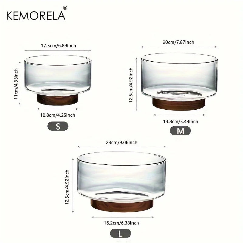 Velká skleněná mísa na ovoce značky KEMORELA. Okrouhlá dizajnová minimalistická skleněná mísa s dřevěným podstavcem. Mísa je dostupná ve třech velikostech, které do sebe zapadají, takže je výhodné zakoupit i jako set. Mísu lze využít na vystavení ovoce v kuchyni, na uskladňování různých pokrmů, na saláty nebo na vánoční cukroví. Kvalitní materiály a precizní dizajn. Rozměry: 17,5 cm, 20 cm a 23 cm průměr.