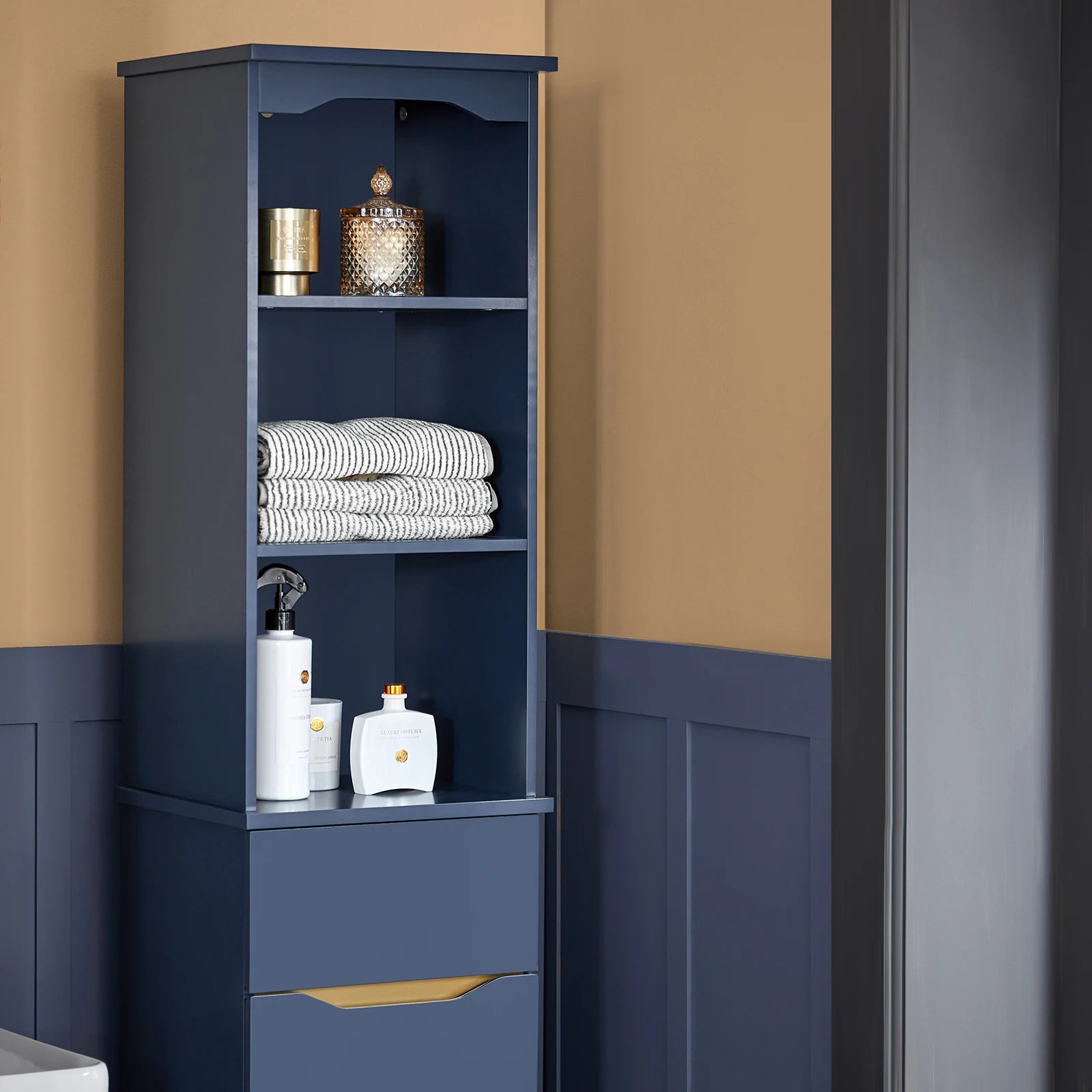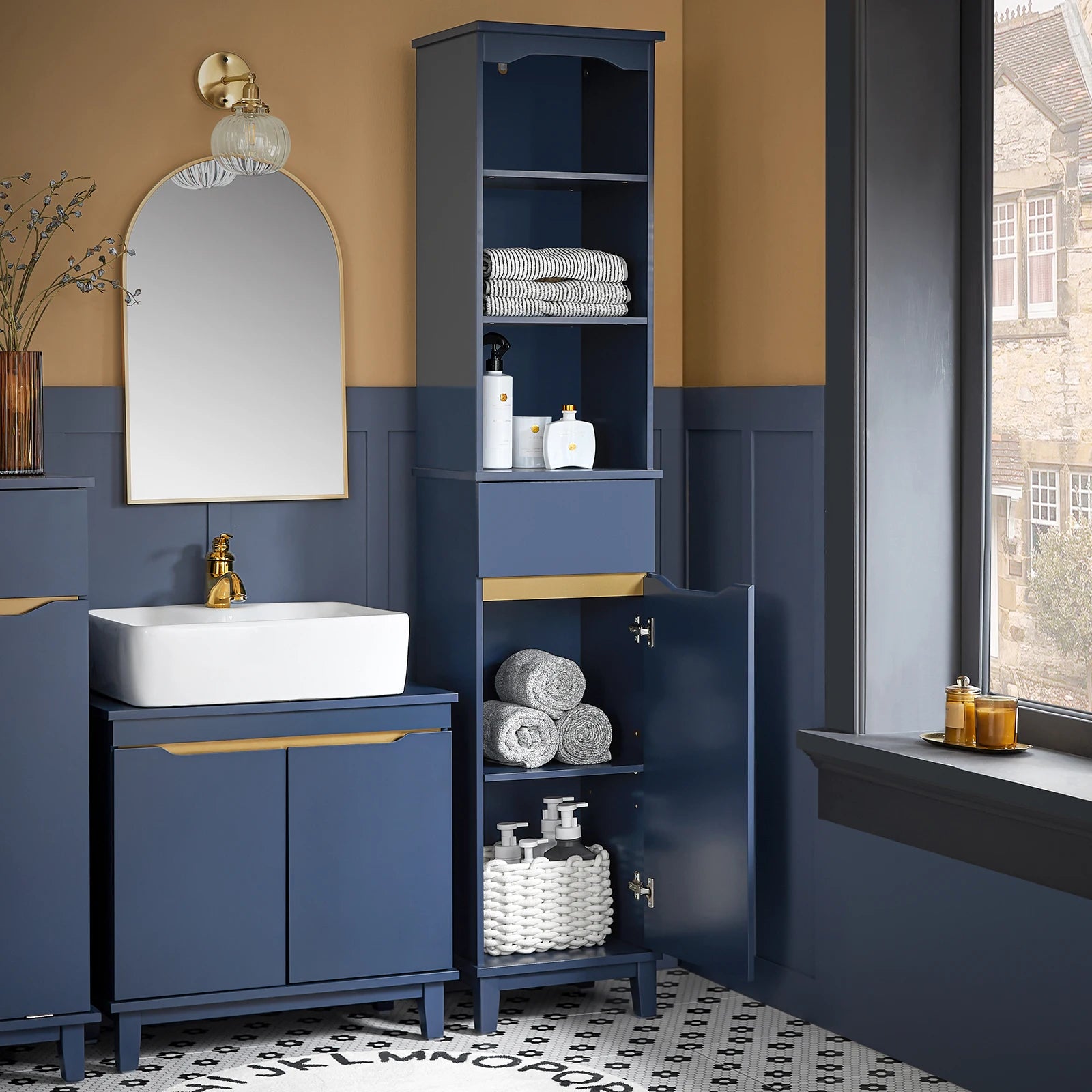 Dodejte své koupelně styl i funkčnost s vysokou skříňkou Douceur. Tento elegantní kousek v tmavě modré barvě doplněný o zlatý detail je ideální pro ty, kteří hledají kombinaci moderního glamour vzhledu a praktického úložného prostoru.